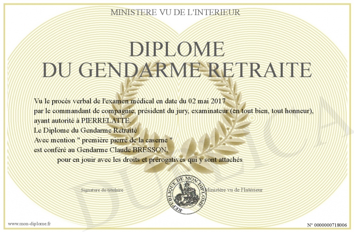 Envoyez par email votre Diplôme du Gendarme Retraité personalisé
