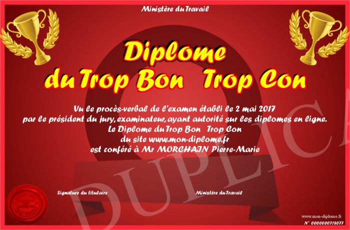 Envoyez par email votre Diplôme du Trop Bon Trop Con personalisé