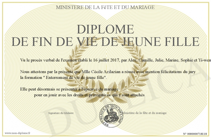 Envoyez par email votre Diplôme de fin de vie de jeune fille personalisé