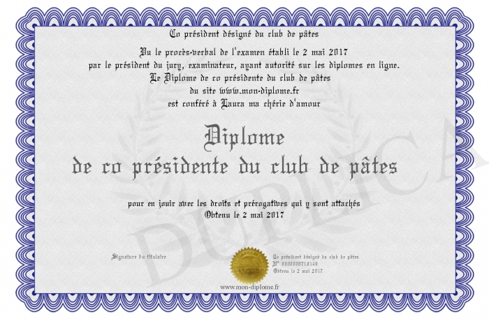 Envoyez par email votre Diplôme de co présidente du club de pâtes personalisé
