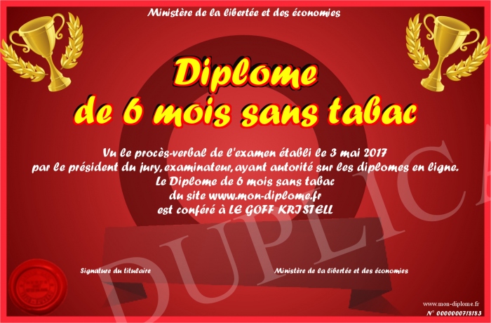 Envoyez par email votre Diplôme de 6 mois sans tabac personalisé