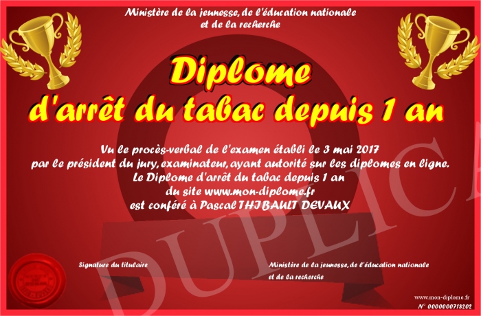 Envoyez par email votre Diplôme d'arrêt du tabac depuis 1 an personalisé