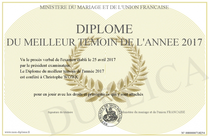 Envoyez par email votre Diplôme du meilleur témoin de l'année 2017 personalisé