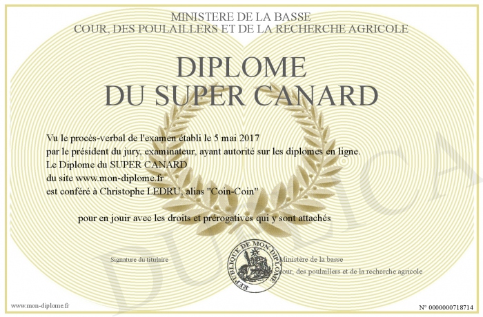 Envoyez par email votre Diplôme du SUPER CANARD personalisé