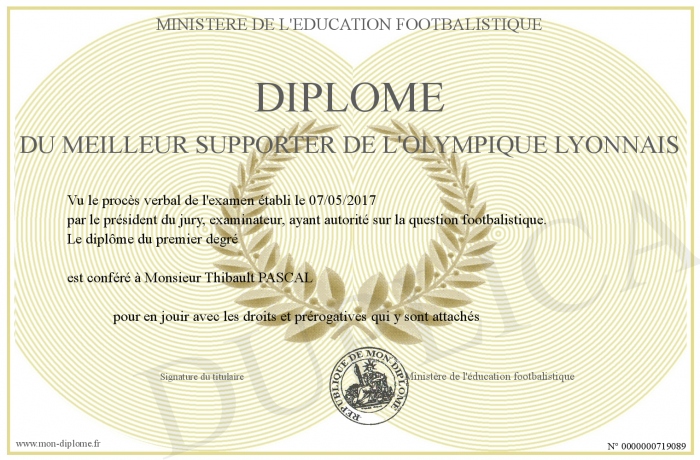 Envoyez par email votre Diplôme du meilleur supporter de l'Olympique Lyonnais personalisé