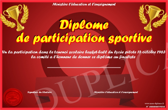 Envoyez par email votre Diplôme de participation sportive personalisé