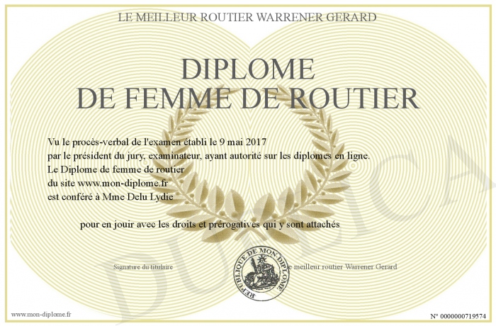 Envoyez par email votre Diplôme de femme de routier personalisé