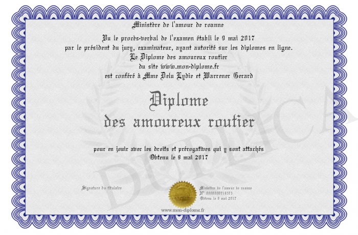 Envoyez par email votre Diplôme des amoureux routier personalisé