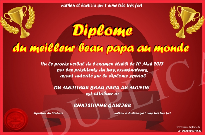 Envoyez par email votre Diplôme du meilleur beau papa au monde personalisé