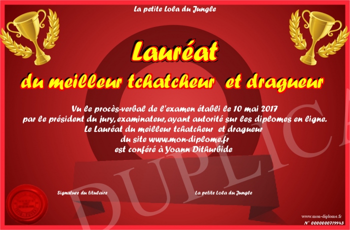 Envoyez par email votre Lauréat du meilleur tchatcheur et dragueur personalisé