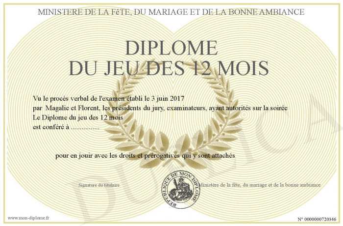 Envoyez par email votre Diplôme du jeu des 12 mois personalisé