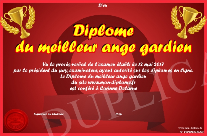 Envoyez par email votre Diplôme du meilleur ange gardien personalisé