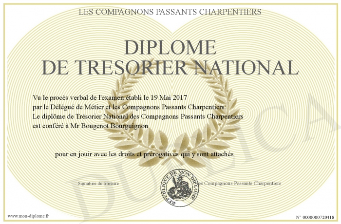 Envoyez par email votre Diplôme de Trésorier National personalisé