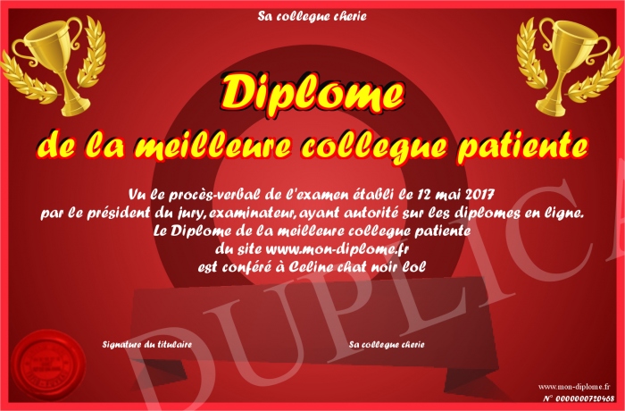 Envoyez par email votre Diplome de la meilleure collegue patiente personalisé