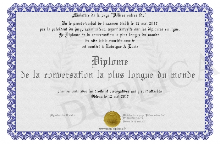 Envoyez par email votre Diplôme de la conversation la plus longue du monde personalisé