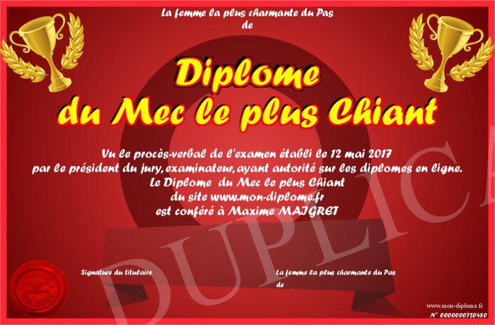 Envoyez par email votre Diplôme du Mec le plus Chiant personalisé