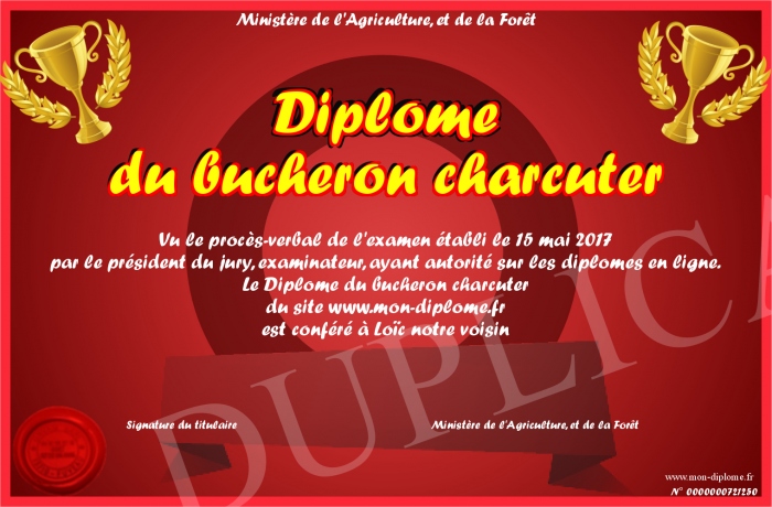 Envoyez par email votre Diplôme du bucheron charcuter personalisé