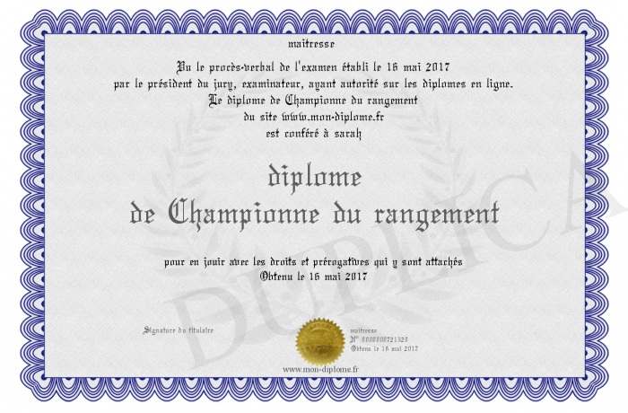 Envoyez par email votre diplome de Championne du rangement personalisé