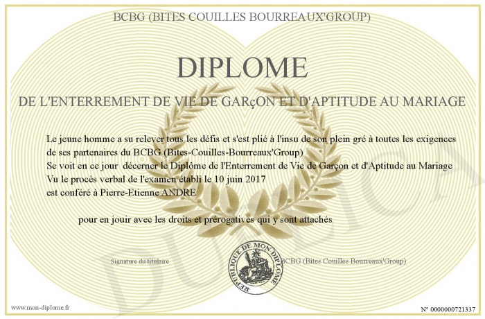 Envoyez par email votre Diplôme de l'Enterrement de Vie de Garçon et d'Aptitude au Mariage personalisé