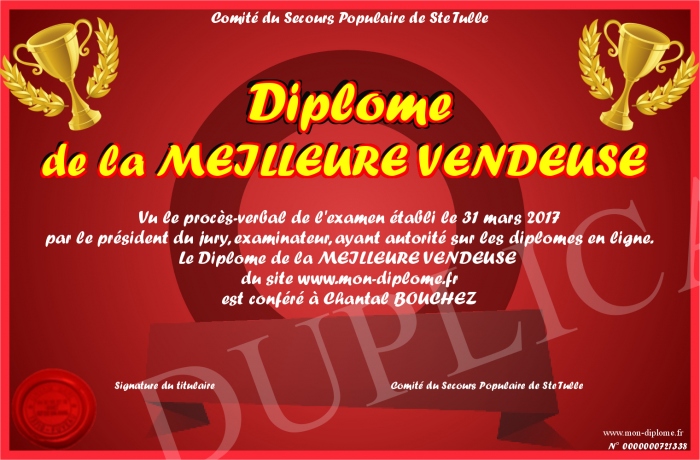 Envoyez par email votre Diplôme de la MEILLEURE VENDEUSE personalisé