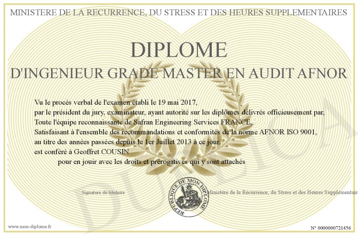 Envoyez par email votre Diplôme d'ingénieur Grade Master en Audit AFNOR personalisé