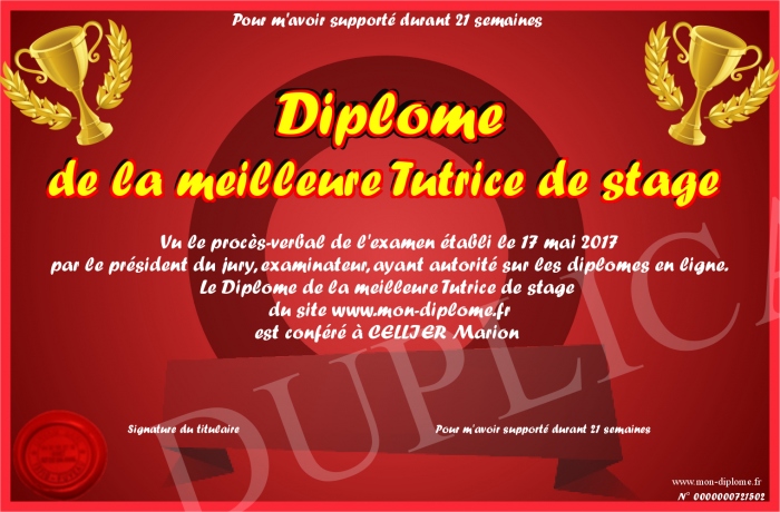 Envoyez par email votre Diplôme de la meilleure Tutrice de stage personalisé