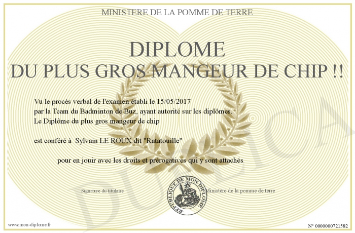 Envoyez par email votre Diplôme du Plus gros mangeur de Chip !! personalisé