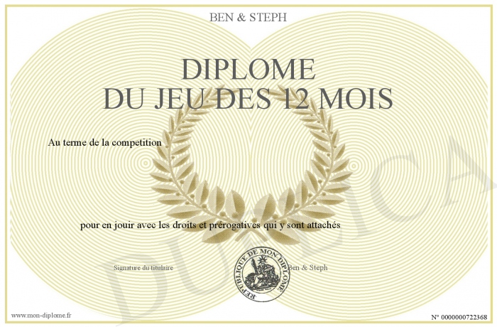 Envoyez par email votre DIPLOME DU JEU DES 12 MOIS personalisé