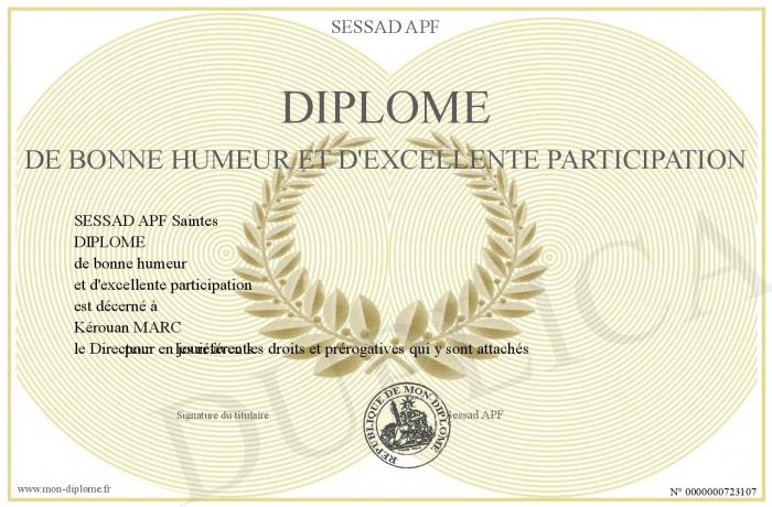 Envoyez par email votre Diplôme de bonne humeur et d'excellente participation personalisé