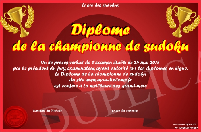 Envoyez par email votre Diplôme de la championne de sudoku personalisé