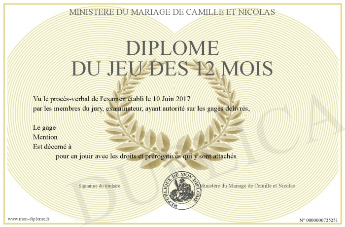 Envoyez par email votre Diplôme du Jeu des 12 mois personalisé