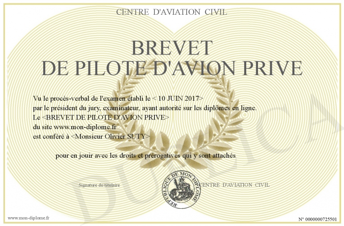 Envoyez par email votre BREVET DE PILOTE D'AVION PRIVE personalisé
