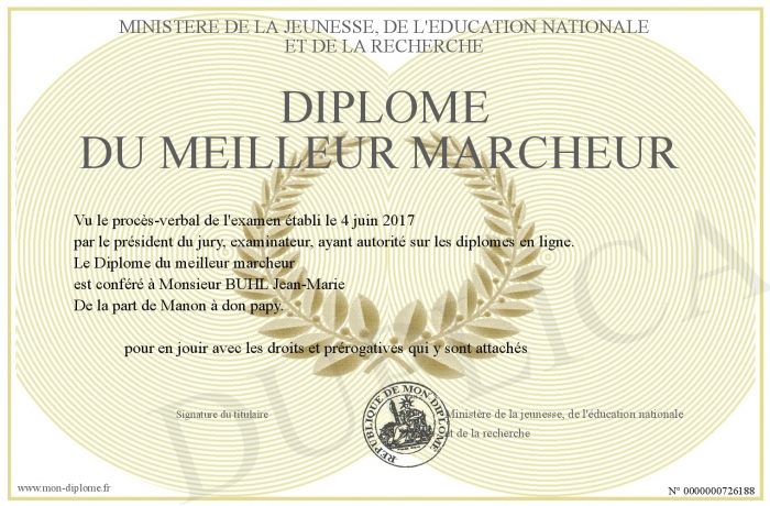 Envoyez par email votre Diplôme du meilleur marcheur personalisé