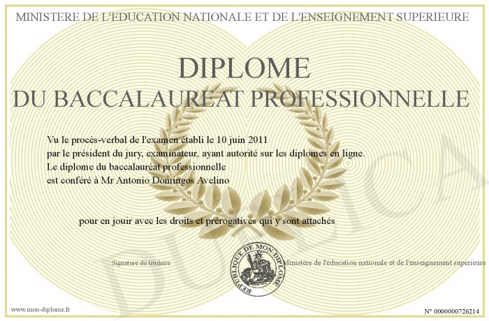 Envoyez par email votre diplôme du baccalauréat professionnelle personalisé