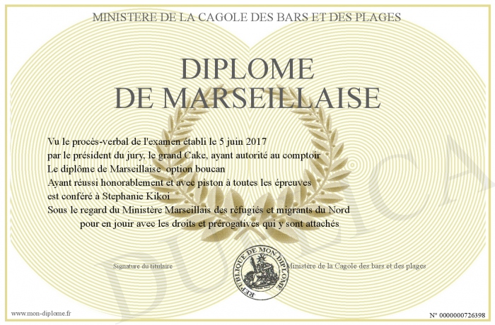 Envoyez par email votre Diplôme de Marseillaise personalisé