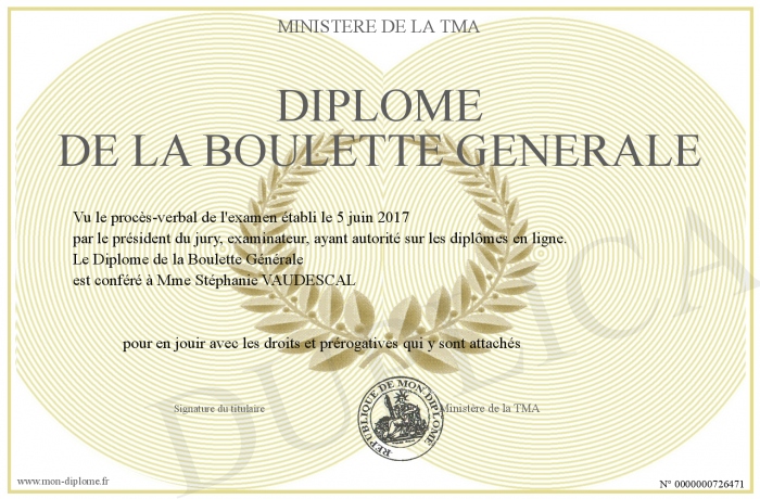 Envoyez par email votre Diplôme de la Boulette Générale personalisé