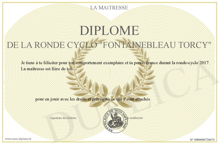 Envoyez par email votre Diplôme de la ronde cyclo -Fontainebleau Torcy- personalisé