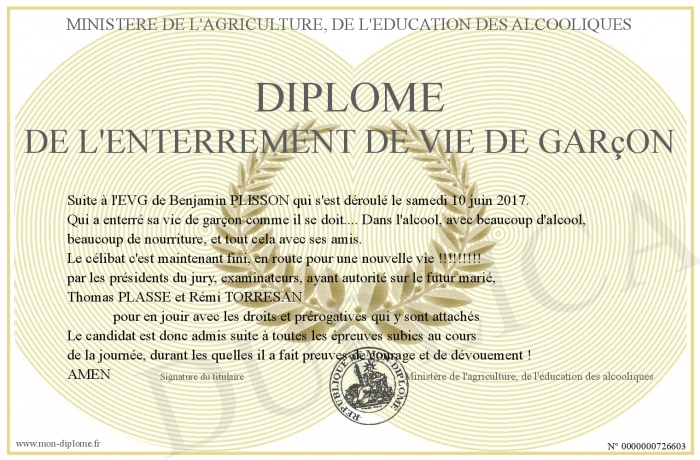 Envoyez par email votre Diplôme de l'enterrement de vie de garçon personalisé