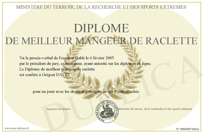 Envoyez par email votre Diplôme de meilleur mangeur de raclette personalisé