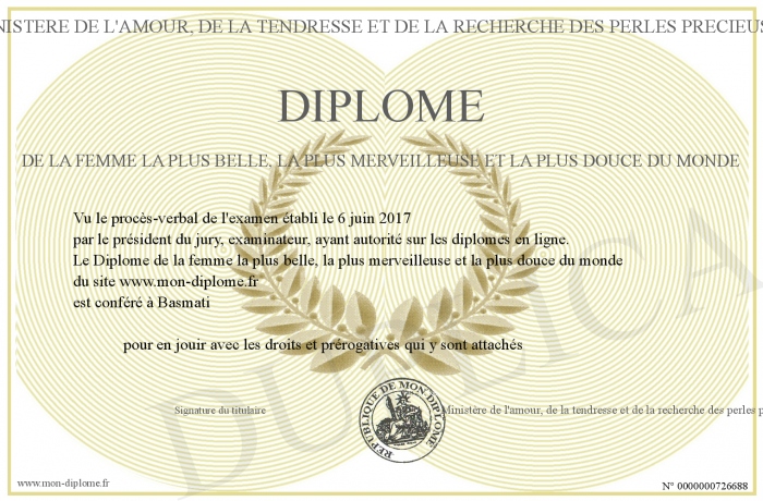 Envoyez par email votre Diplôme de la femme la plus belle, la plus merveilleuse et la plus douce du monde personalisé