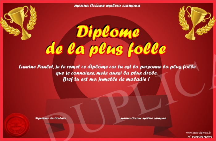 Envoyez par email votre Diplôme de la plus folle personalisé