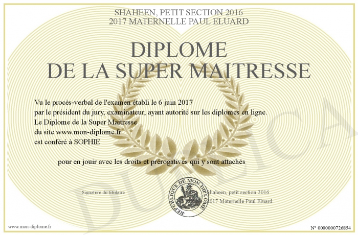 Envoyez par email votre Diplôme de la Super Maitresse personalisé