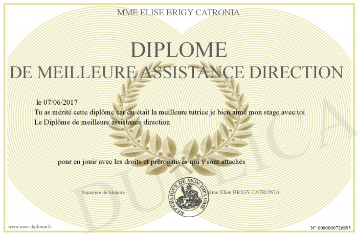 Envoyez par email votre Diplôme de meilleure assistance direction personalisé