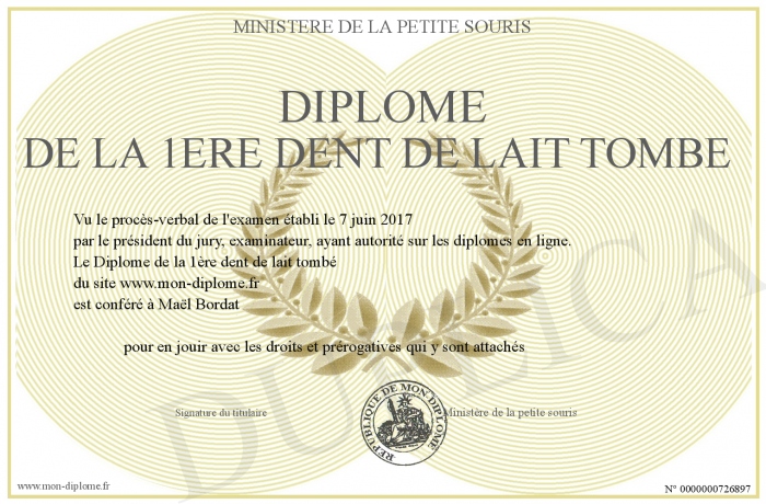 Envoyez par email votre Diplôme de la 1ère dent de lait tombé personalisé