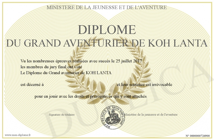 Envoyez par email votre Diplôme du Grand aventurier de KOH LANTA personalisé