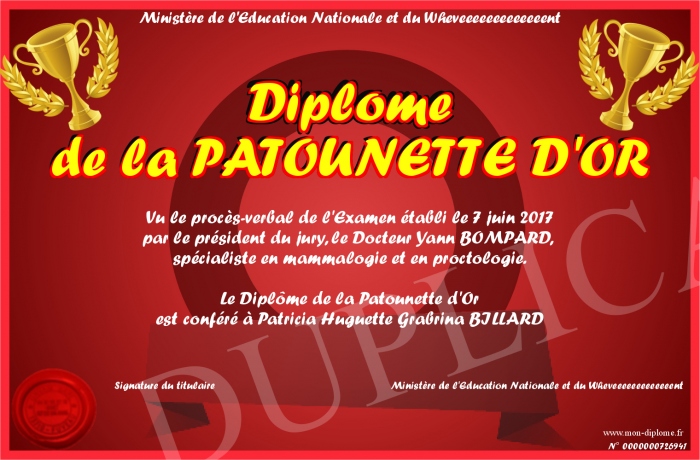Envoyez par email votre Diplôme de la PATOUNETTE D'OR personalisé