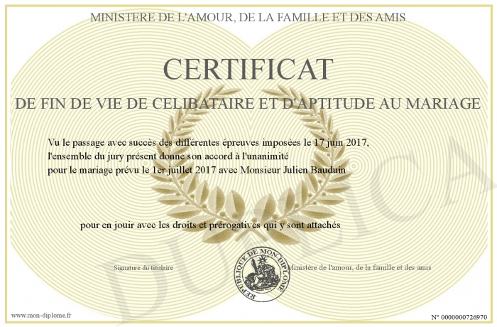 Envoyez par email votre Certificat de fin de vie de célibataire et d'aptitude au mariage personalisé