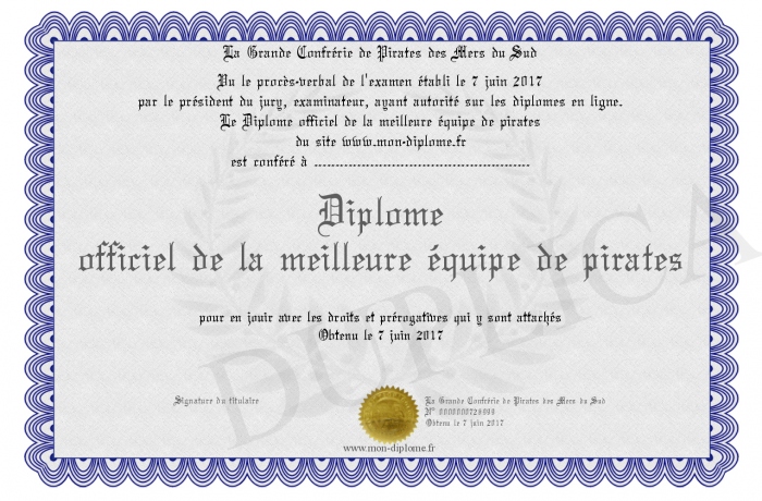 Envoyez par email votre Diplôme officiel de la meilleure équipe de pirates personalisé