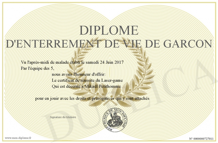 Envoyez par email votre Diplôme d'enterrement de vie de garcon personalisé
