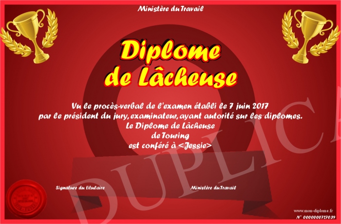 Envoyez par email votre Diplôme de Lâcheuse personalisé